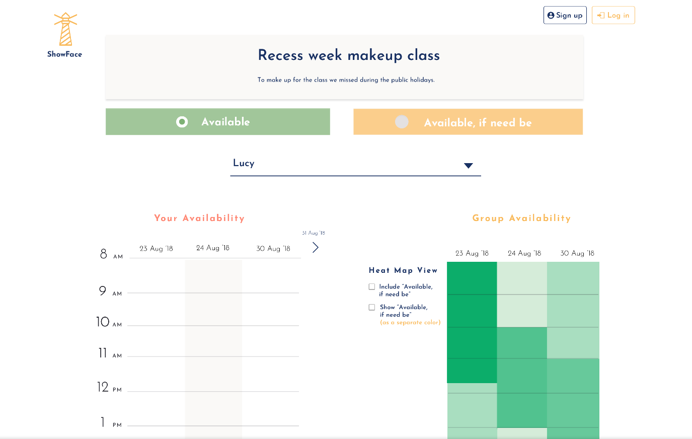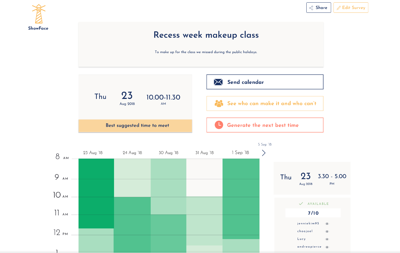 View everyone's schedules in a timetable-style heatmap. Immediately see who is busy at any particular time and easily identify the timeslots with the highest availability!